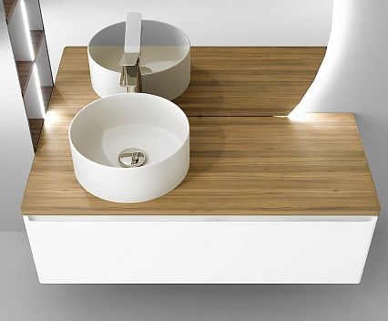 Подвесная тумба для ванной Solis 120 со столешницей из массива бука выражает современную ценность натуральности. Корпус и фасад тумбы выполнен из МДФ в белой глянцевой пленке ПВХ. Тумба оснащена ящиком с интегрированной ручкой, системой Metabox и стеклянным разделителем.
