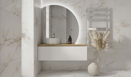 Вариативность комплектации зеркала позволяет адаптировать коллекцию по ширине, функционалу и визуальному богатству образа. Большое круглое зеркало с подсветкой по периметру, напоминающее солнечный диск, увеличивает пространство ванной комнаты, смягчает его и придает гармонию интерьеру ванной комнаты. Светодиодная подсветка зеркала оснащена бесконтактным выключателем. Пенал, встроенный в зеркало, имеет дополнительную вертикальную подсветку.