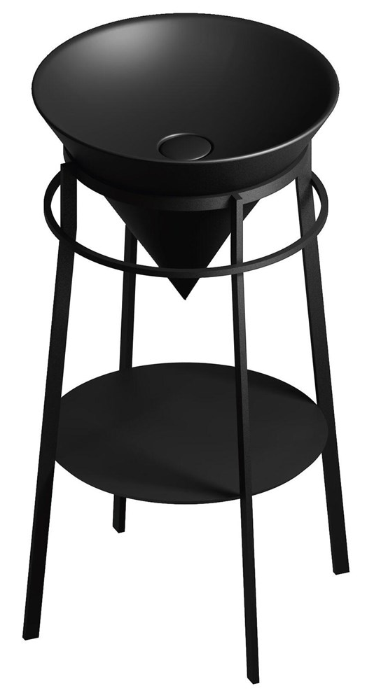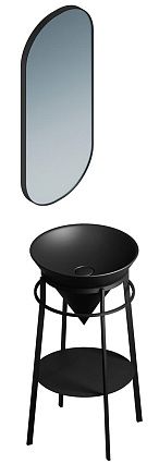 Металлическая структура матовая черная с раковиной с бортиком. По периметру расположен большой держатель для полотенца, а ниже предусмотрена установка круглой полки из санкерамики (2 варианта цвета)