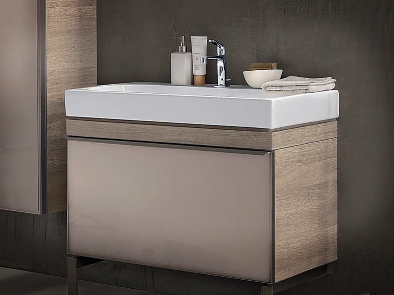 Необычные тумбы под раковины со стеклянными панелями в цвете металлической планки. Опционально тумбы под раковину могут комплектоваться ножками. Верхняя стеклянная панель под встраиваемые раковины соответствует по цвету тумбам под раковину.