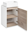 - Корпус зеркального шкафа классический белый, но при этом нижняя открытая полка выполнена в контрастном цвете - крафтовый дуб