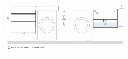 Тумба под раковину над стиральной машиной подвесная Марс 68 (под ум. Лидер 1300). Корпус изделия выполнен из влагостойкого ЛДСП, фасад из МДФ. Фасадные и боковые стенки мебели окрашены высокоглянцевой эмалью. В тумбе есть доступ к подключению коммуникаций. Тумбу можно устанавливать как под левую, так и под правую раковину.