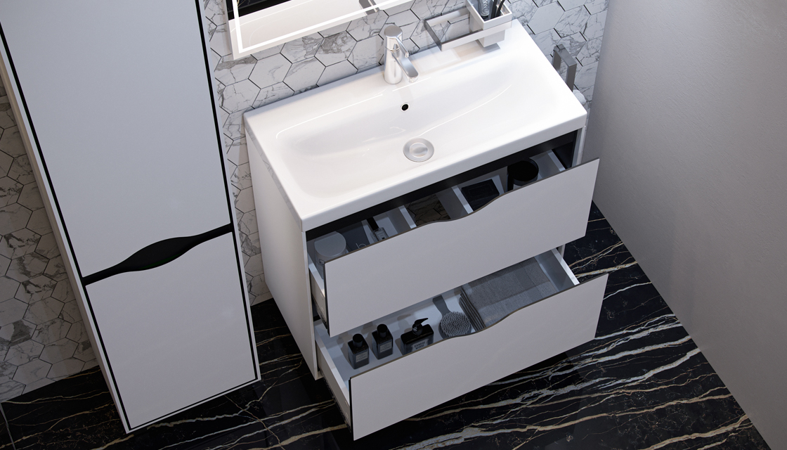 - Материалы тумбы: МДФ, влагостойкая ЛДСП, полимерное покрытие ПВХ, врезная ручка, европейская фурнитура