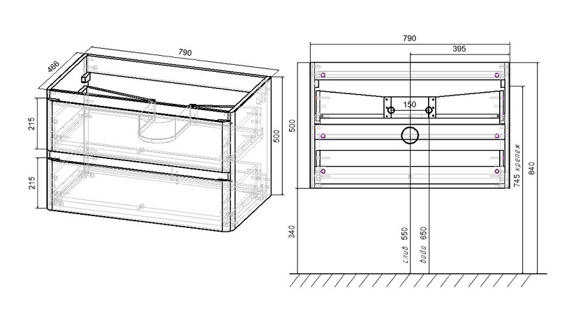 - Тумба комплектуется раковинами VCB-2VP800W (белая), VCB-2VP800B (черная), VCB-2VP600G (серая)
