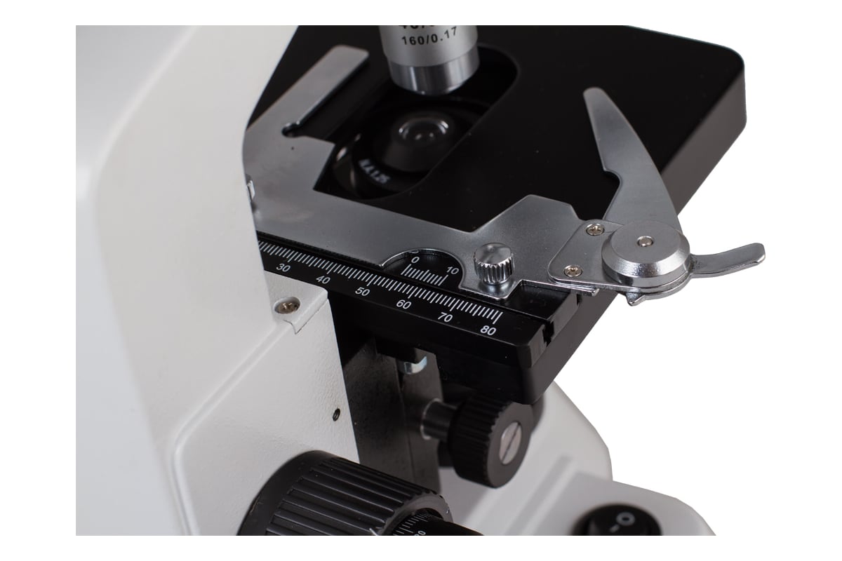 .Предметный столик с нониусом позволяет закреплять сразу два образца для изучения, а ручки грубой и тонкой подстройки обеспечивают максимально точное позиционирование объекта под объективом микроскопа.