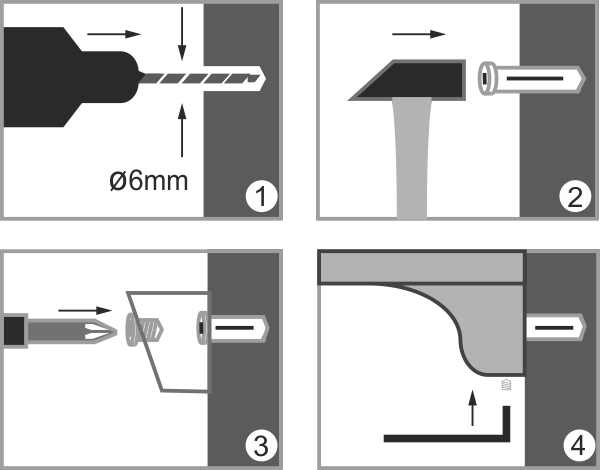 - Монтажная пластина крепится к стене саморезами, после чего изделие крепится к пластине при помощи стопорного винта.