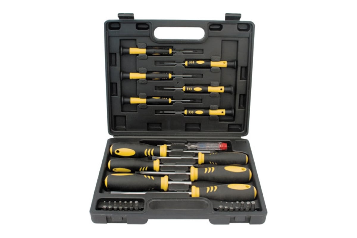 Набор отверток FIT IT 56402 применяется для ремонта электроники, мелких креплений и прочих соединений с различными видами профиля. Он состоит из множества отверток и бит. Все предметы из набора изготовлены из высокопрочной хромованадиевой стали. Удобные рукоятки обрезинены, что исключает скольжение и делает работу более комфортной. Все предметы из набора уложены в специальный кейс, что упрощает хранение и транспортировку.