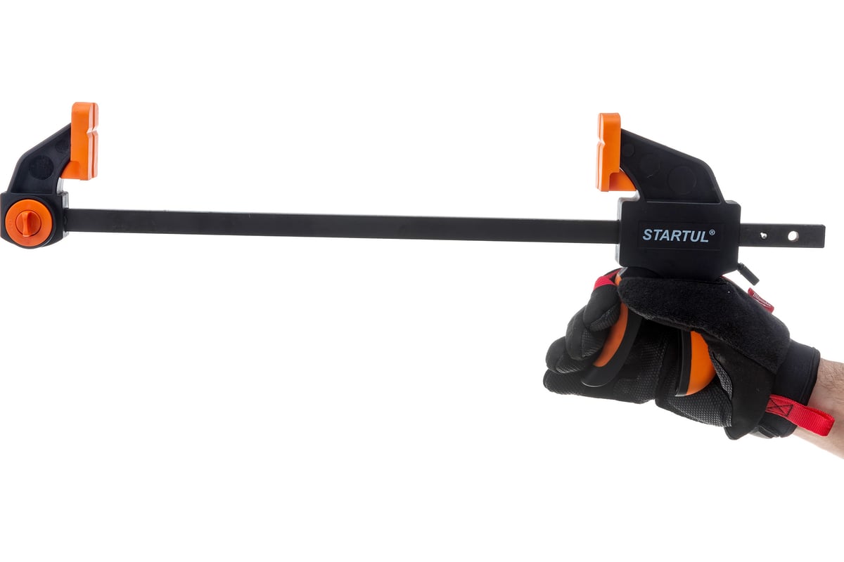 Пистолетная струбцина STARTUL Profi 350x60 мм ST9026-35 применяется для надежной фиксации предметов во время склеивания, сборки или обработки. Опорная губка перемещается и фиксируется по всей длине направляющей при помощи рукоятки, а также может переставляться на другой конец направляющей, что позволяет использовать струбцину "на разжим". Струбцина выполнена из качественного ударопрочного пластика, а направляющая - из стали. Рабочие губки снабжены мягкими накладками для предотвращения повреждений обрабатываемых предметов.