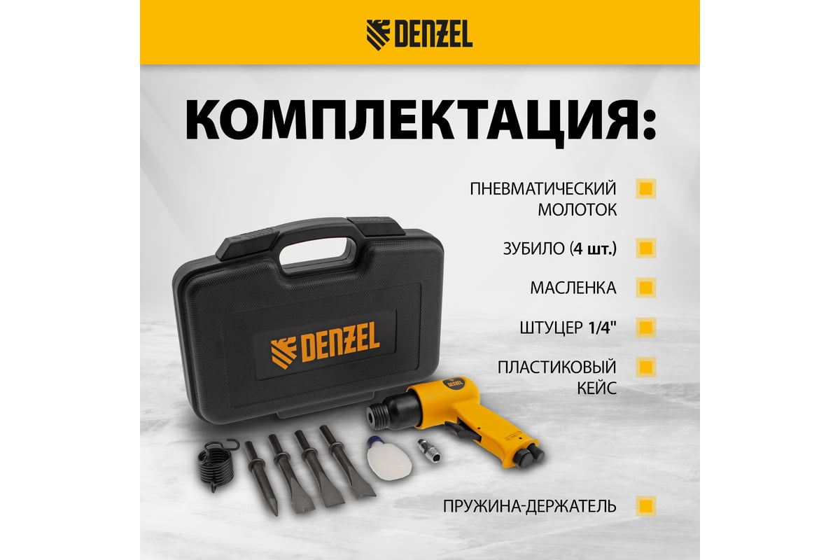 Пневматический молоток Denzel HP4500 57468 с набором насадок обеспечивает производительность 4500 уд/мин при среднем расходе сжатого воздуха 113 л/мин.