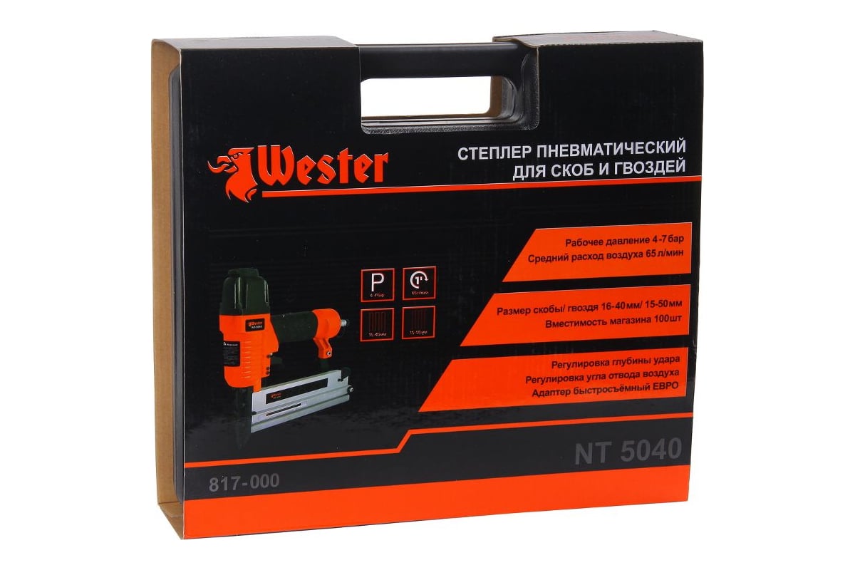 Пневматический степлер WESTER NT-5040 74649 предназначен для монтажных и отделочных работ. С его помощью к деревянным поверхностям крепят ткани, пластик, ДВП и другие материалы. Работает с гвоздями и скобами всех ходовых размеров.