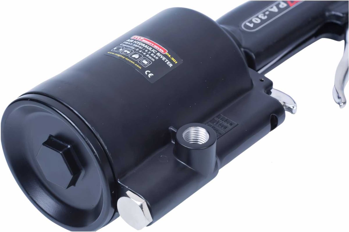 Пневмогидравлический заклепочник MIGHTY SEVEN PA-301 - современное устройство для соединения различных деталей с помощью заклепок. Приспособление широко используется в авиационной, автомобильной, а также судостроительной промышленности. Агрегат работает на сжатом воздухе, что обеспечивает высокую производительность работы при минимуме усилий. Для подключения заклепочника к компрессору рекомендуется использовать шланг с внутренним диаметром 10 мм.