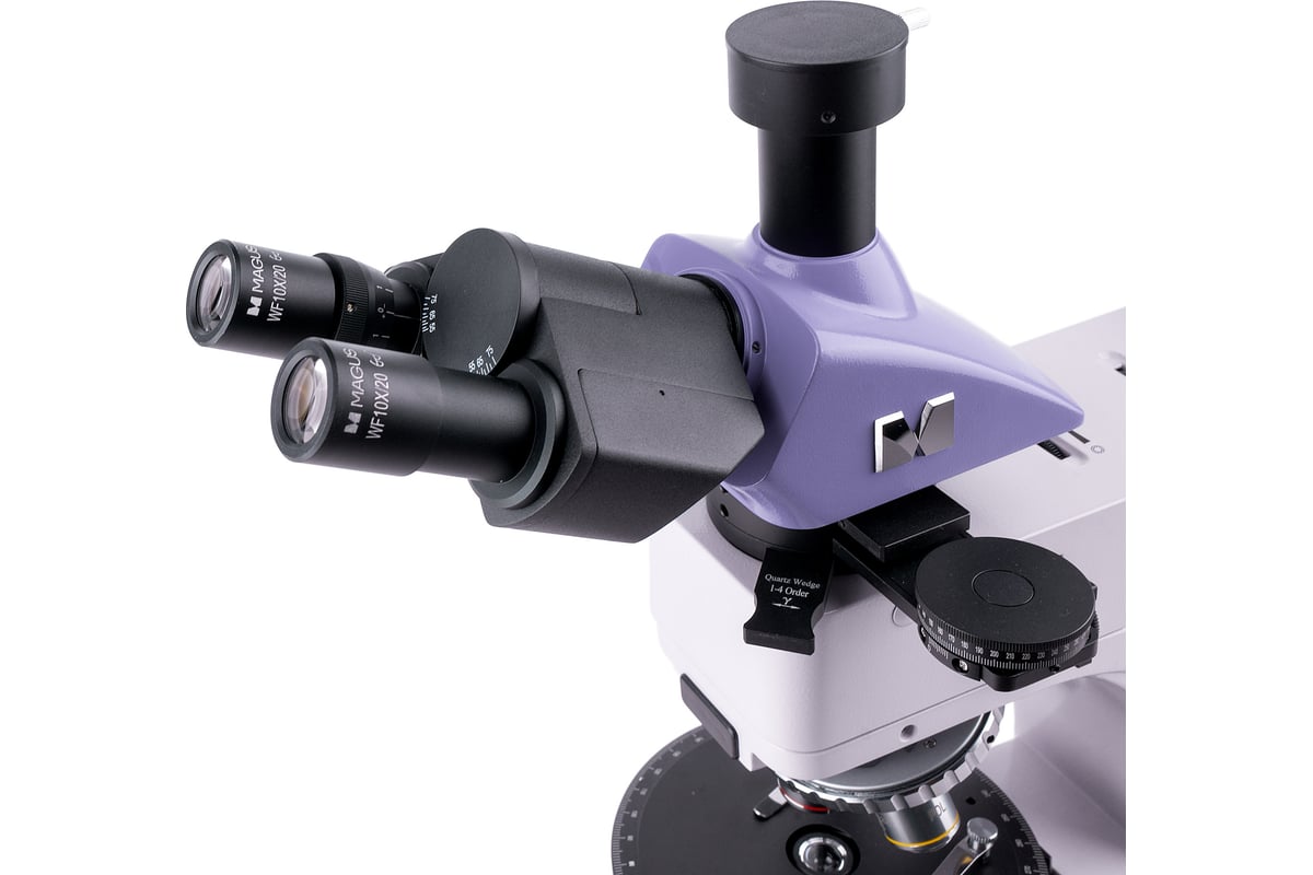 .Для формирования изображения поляризационный микроскоп использует оптическое свойство двойного лучепреломления анизотропных объектов. Плоско-поляризованный свет при прохождении через анизотропный образец расщепляется на два луча и меняет плоскость поляризации. Анализатор приводит колебания лучей в одну плоскость, где они интерферируют. Яркое высококонтрастное изображение меняет цвет при вращении столика. Объективы микроскопа свободны от внутренних напряжений. В промежуточном тубусе установлены анализатор и линза Бертрана, есть слот для установки компенсаторов.