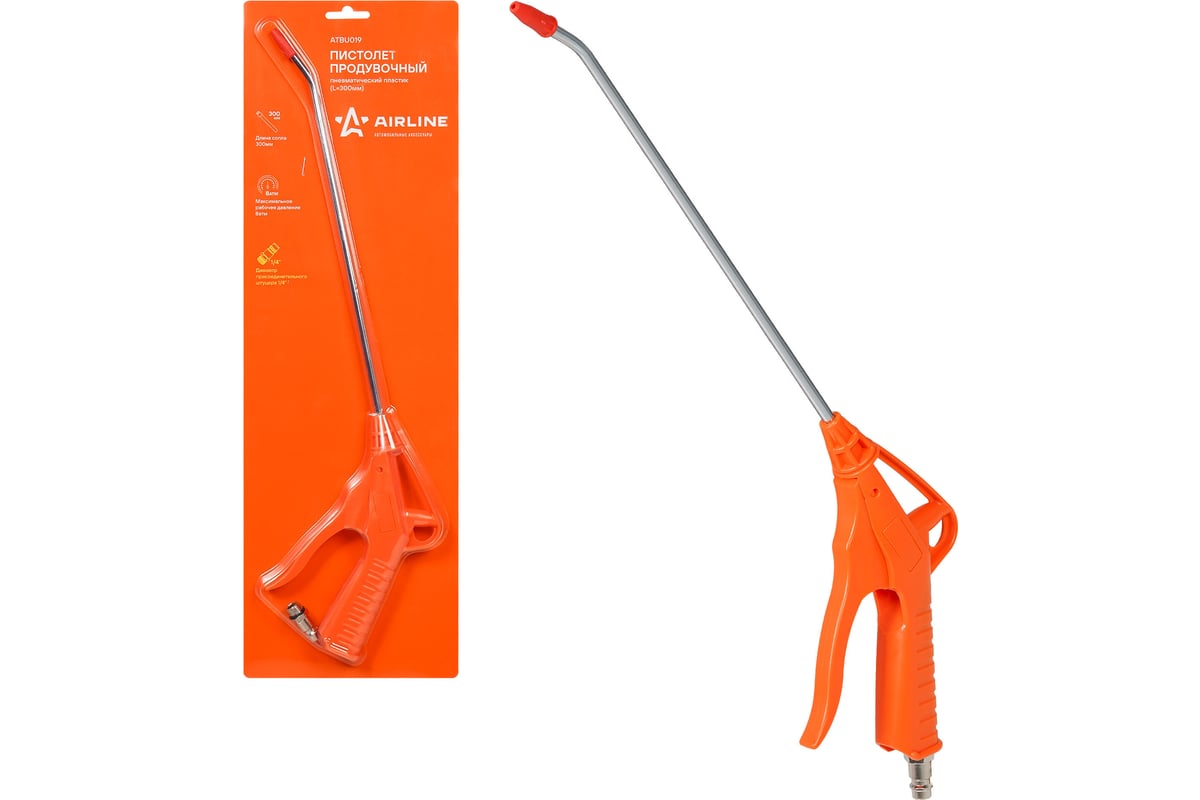 Пистолет продувочный пневматический пластик (L=300мм) AIRLINE ATBU019 имеет корпус, выполненный из ударопрочного пластика. В комплект входит присоединительный фитинг 1/4".