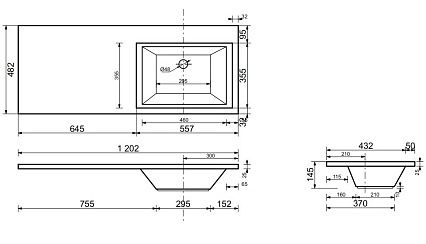 Раковина из литьевого мрамора имеет длинную платформу, которая выходит далеко за пределы тумбы. Она предназначена для того, чтобы установить с левой стороны от тумбы стиральную машину. Платформа имеет такую длину, которая позволит спрятать под нее машинку средних размеров с фронтальной загрузкой.