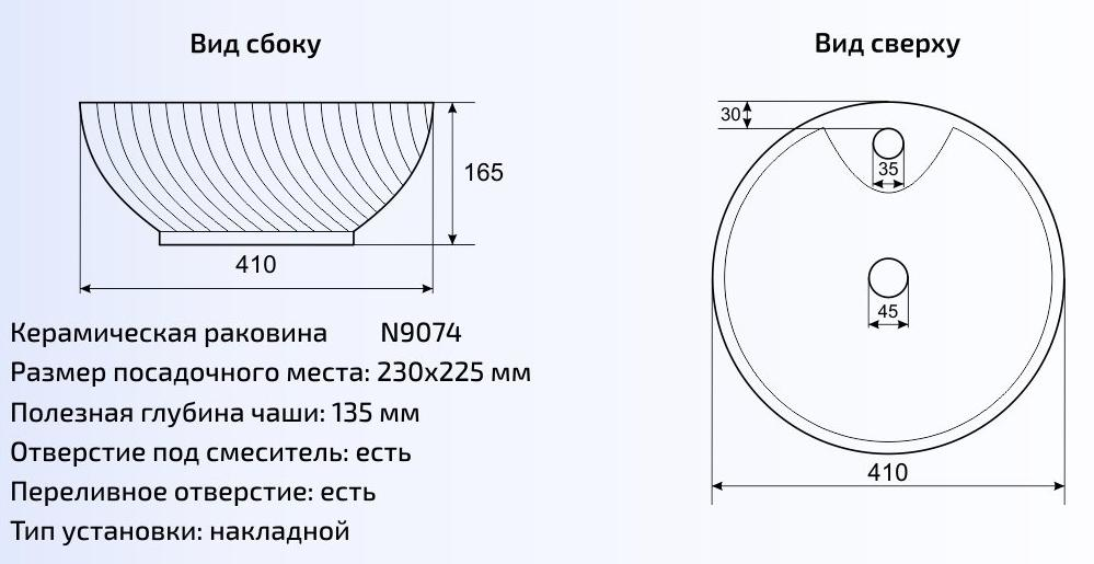 Раковина для ванной N9074 монтируется на столешницу или мебель. Модель N9074 оборудована переливным отверстием, на случай когда чаша будет переполняться. Поддерживать её в чистоте не составит труда. Для фаянсовых поверхностей рекомендуется использовать моющие жидкости и гели со значением pH не более 10.