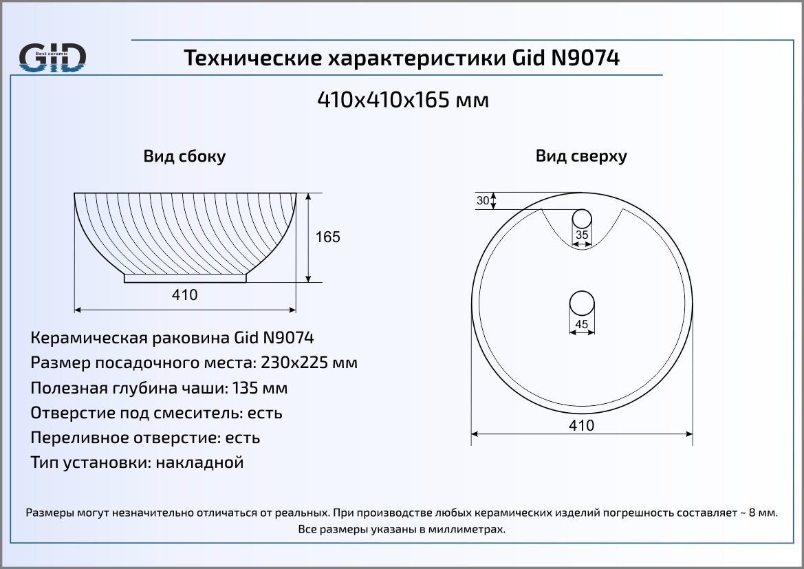 Раковина Gid N9074 41 см накладная. Без отверстия под смеситель, с переливом.