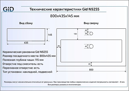 Раковина Gid N9255 80 см накладная. С отверстием под смеситель, с переливом.