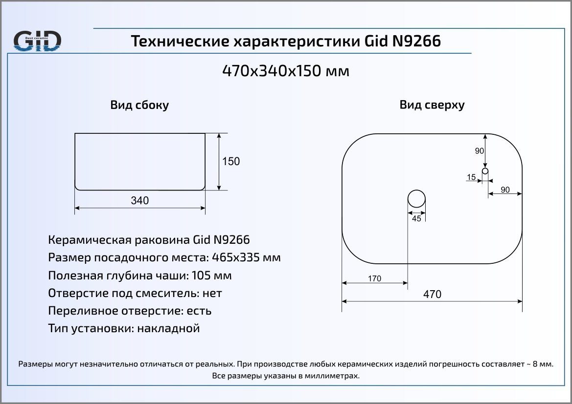 Раковина Gid N9266 47 см см накладная. Без отверстия для смесителя, с переливом.