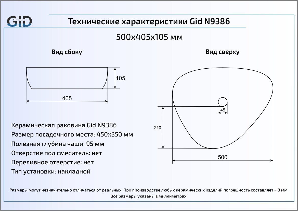 Раковина Gid N9386 50 см накладная. Без отверстия под смеситель, без перелива.