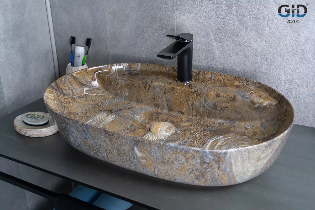 - керамическая раковина накладная Gid Mnc346T под камень с отверстием под смеситель привлекает удобством и простотой монтажа