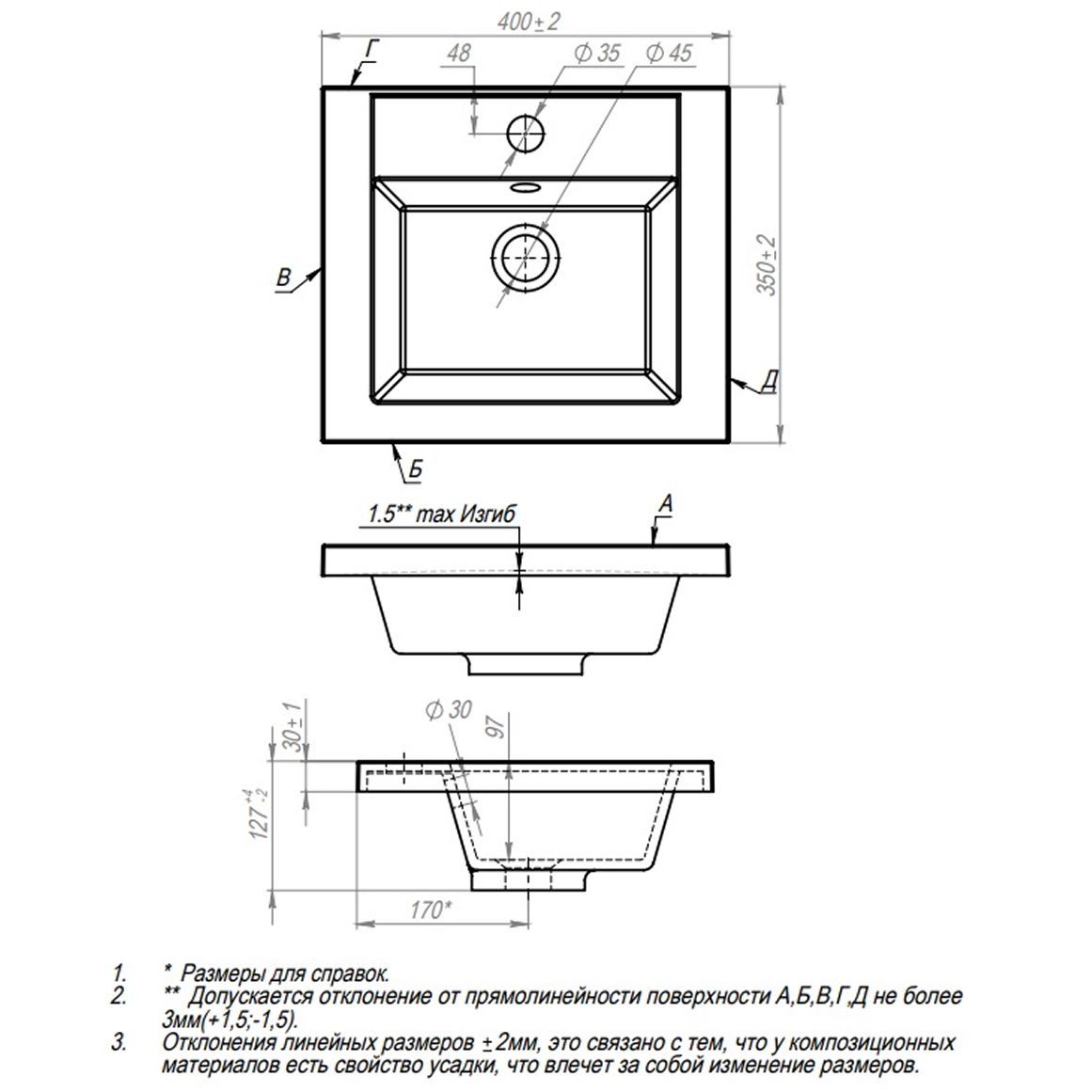 - Умывальник оснащён одним отверстием под смеситель, сливным отверстием диаметром 4 см и переливом.