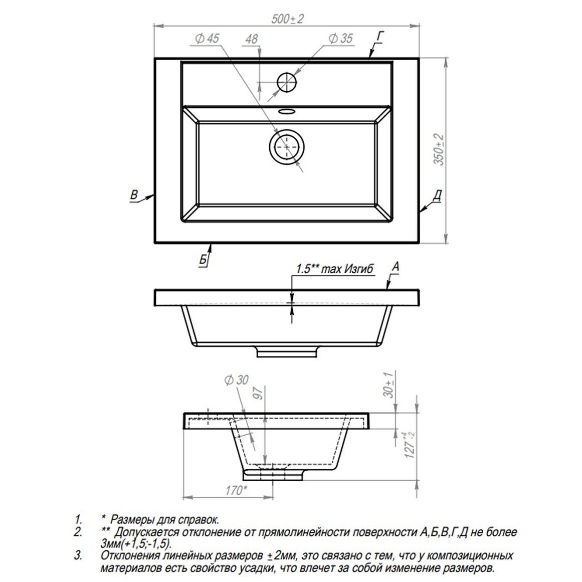 - Умывальник оснащён одним отверстием под смеситель, сливным отверстием диаметром 4 см и переливом.