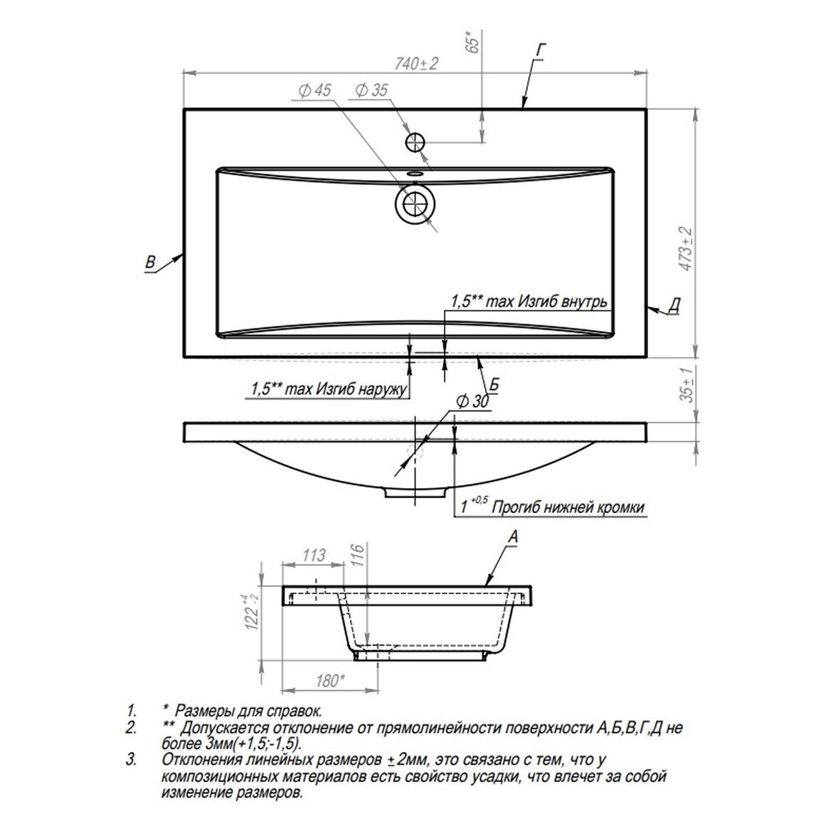- Умывальник оснащён одним отверстием под смеситель, сливным отверстием диаметром 4 см и переливом.