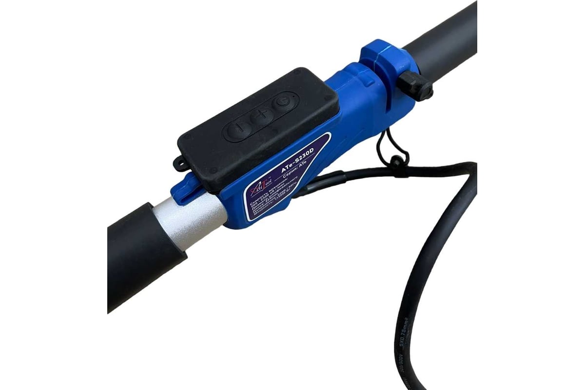 Шлифовальная машина Жираф ATe-S230D с системой пылеудаления, оснащена бесщеточным двигателем, турбиной с регулировкой вакуума и светодиодной подсветкой рабочей зоны. Имеет в комплекте съемный пульт включения/выключения и регулировки скорости вращения от 500 до 2300 об/мин. Предназначена для шлифования стен и потолков после нанесения раствора, а также для удаления старой краски, остатков от старых обоев. Мощность шлифовальной машины Жираф ATe-S230D 1150 Вт, что превышает в минимальные требования в 500 Вт. Большая мощность двигателя положительно сказывается на ресурсе инструмента. Съемный край контура защитного кожуха тарелки (шасси) позволяет увеличить эффективность и уменьшить ручной труд (обработка поверхности у стыков и углов на 4 см больше). Телескопическая рукоятка с регулировкой длины позволяет работать со стенами и потолком высотой до 3 метров стоя на полу. Конструкцией машинки также предусмотрено вращение «головы» в разные стороны с углом наклона до 120 градусов. Подошва машинки оснащена тарелкой с липучкой для быстрой смены шлифовальной бумаги. Шлифовальная машина Жираф ATe-S230D – имеет складную конструкцию, что делает транспортировку и хранение более удобными. Шлифовальный машина для гипсокартона.