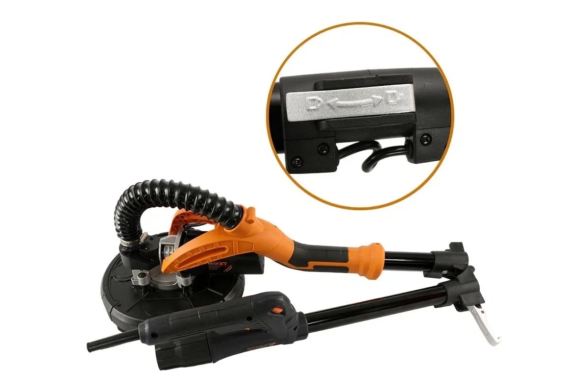 .Для достижения хороших результатов обработки и комфортной работы, шлифмашина оснащена телескопической ручкой с изменяемыми размерами от 110см до 165cм., что позволяет выполнять работы высотой до 3 метров.
