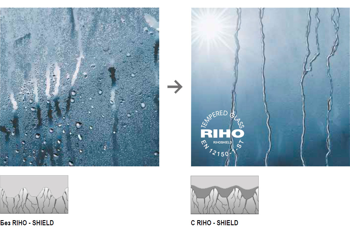 Riho Shield - предотвращает образование капель, обеспечивает хороший отвод воды с обработанной поверхности стекла. С Riho Shield обслуживание стекла проще. Для очистки стекла требуется меньше времени, что также позволяет сократить количество необходимых моющих средств. Тем не менее, Riho Shield не заменяет регулярную чистку. Для обработки стекла используйте влажную необразивную салфетку (не мочалку из микрофибры!). Лучших результатов вы добьетесь используя обычный очиститель стекла. Обратите внимание на то, что срок службы Riho Shield зависит от жесткости воды.