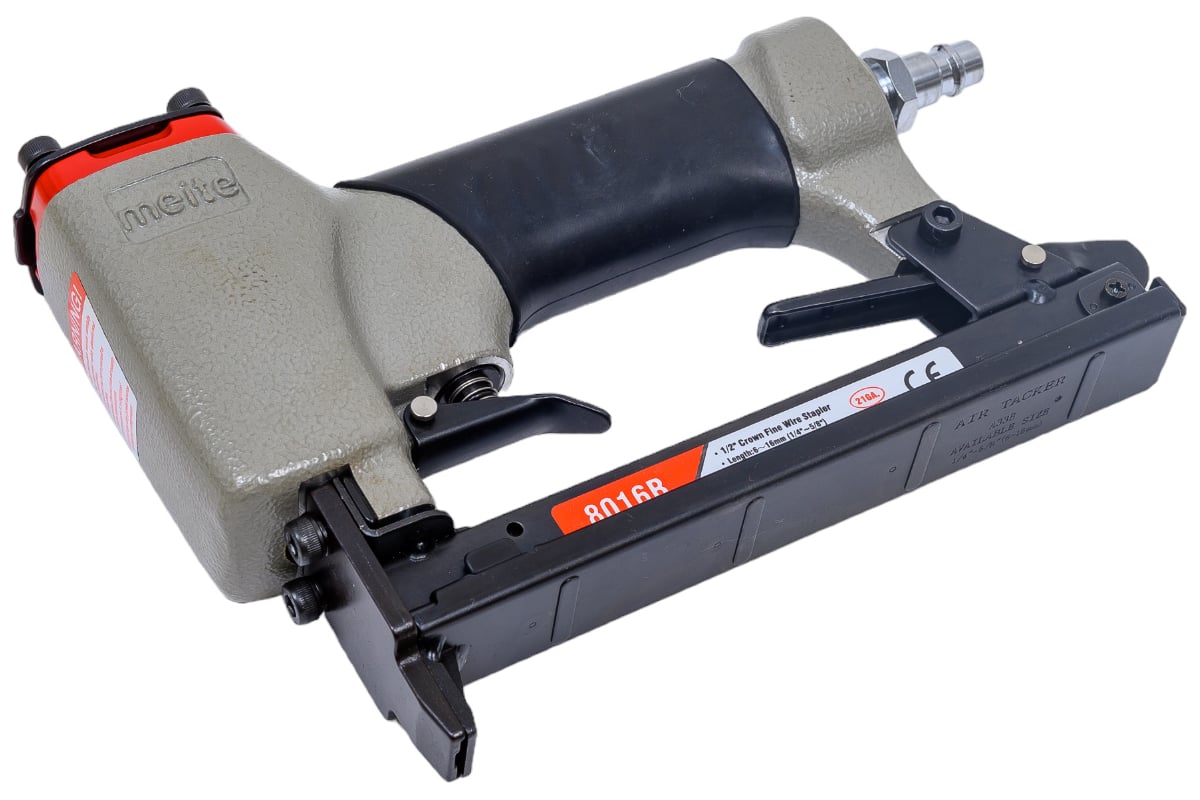 Скобозабивной обивочный пневмоинструмент MEITE 8016B GBA33B00303 использует мебельную скобу калибра 21Ga в диапазоне от 6 мм до 16 мм. Применяется в первую очередь при изготовлении и ремонте мягкой мебели, в специально организованных местах как внутри помещений, так и на открытом воздухе с переменной влажностью и минусовой температурой.