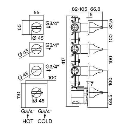 - Дополнительно приобретается скрытая часть смесителя Bossini: для скрытых частей: на 3 выхода — Z030202000, на 4 выхода — Z030271000, на 6 выходов — Z030273000