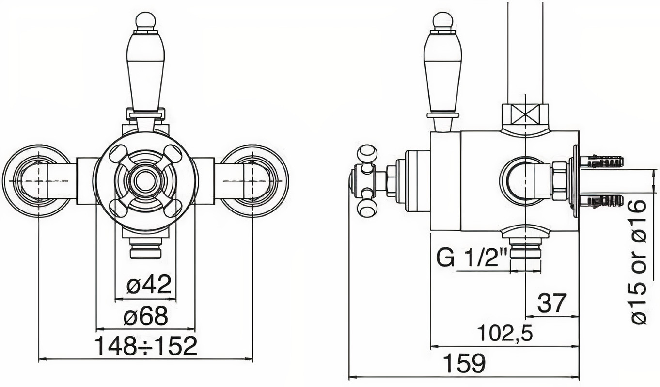 - Смеситель термостатический на один выход, верхнее (жесткое подключение)