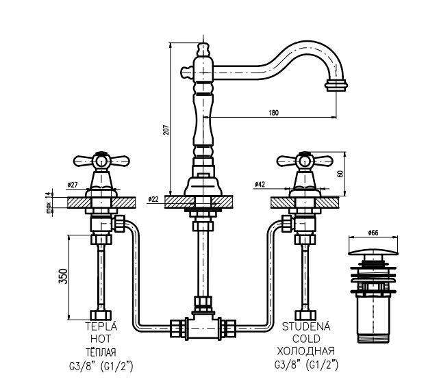 Смеситель для раковины Morava retro MK332.5SM с двухвентильной системой управления и донным клапаном. Эта модель предполагает монтаж на три отверстия. Удобная система управления с помощью металлических рычагов. Керамическая кран-букса производства Германии. Поворотный излив обеспечивает комфортное использование смесителя. В комплект входит донный клапан системы Click-Clack.
