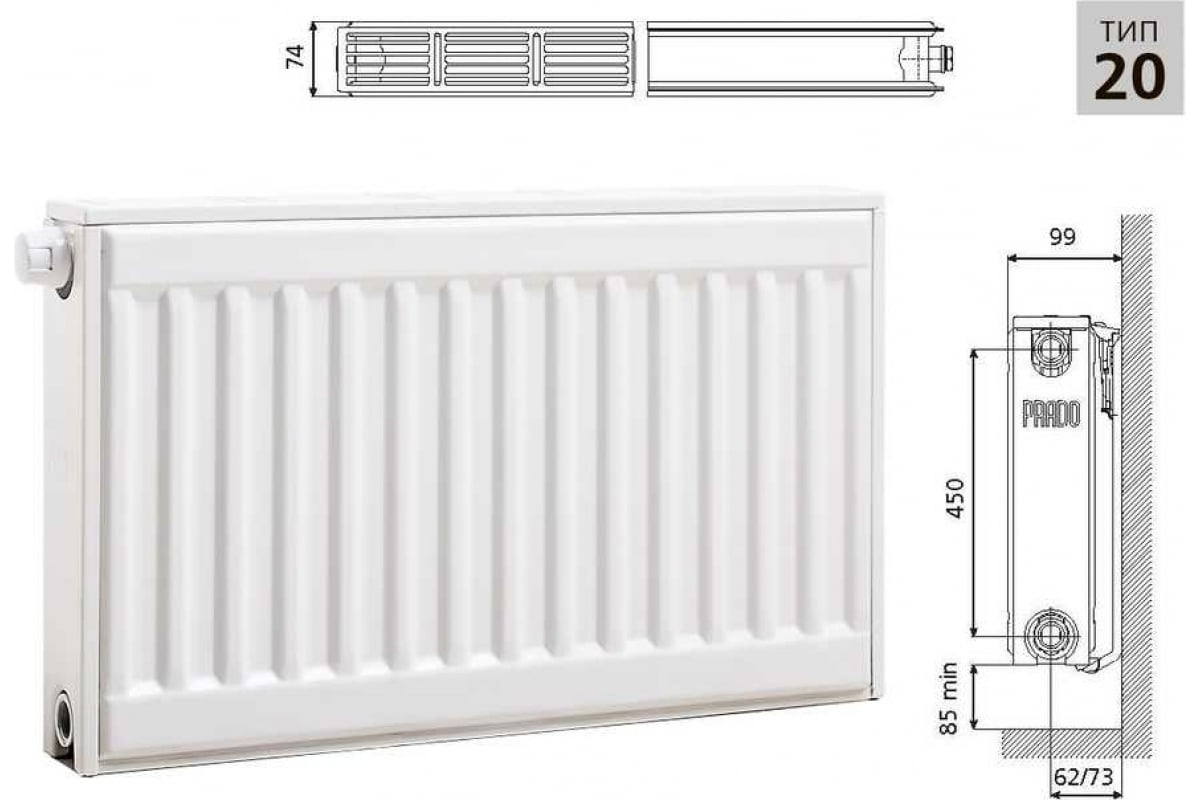 Тип 20 - два ряда панелей без конвекционного оребрения, боковые поверхности закрыты защитными элементами, верхняя поверхность закрыта планкой типа "гриль".