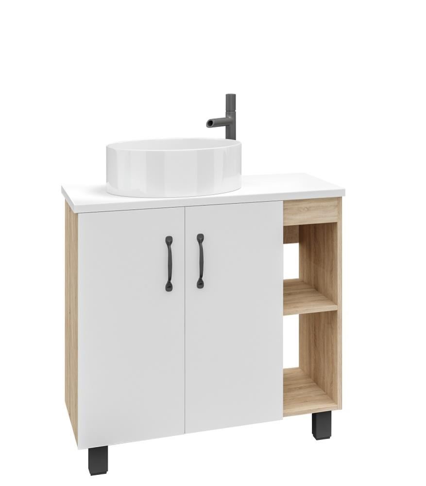Столешница Флай 80 cм выполнена из МДФ: белая матовая пленка с покрытием SoftTouch придаст современный вид и позволит установить накладную раковину.