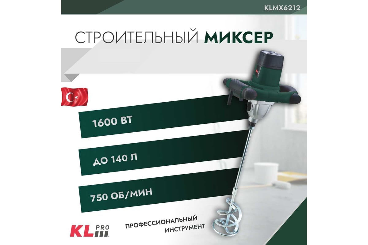 Строительный миксер KLPRO KLMX6212 – профессиональный инструмент, мощностью 1600 Вт и с диаметром наконечника 160 мм. Резьба шпинделя – М14, две скорости работы.