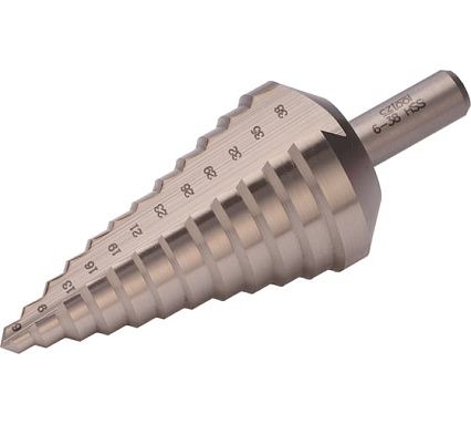 Ступенчатое сверло 6-38мм HSS хв. 10мм 641030, предназначено для сверления и рассверливания сквозных отверстий в листовом металле, а также с его помощью можно обрабатывать фаски и снимать заусенцы в отверстии.