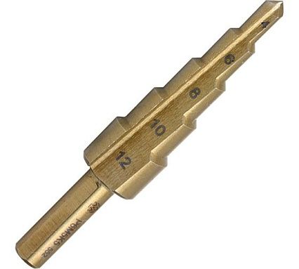 Сверло ступенчатое 4-12 мм, 5 ступеней, Р6М5К5 Волжский Инструмент 5036001 предназначено для получения отверстий различного диаметра без перестановки режущего инструмента. На каждой ступени есть маркировка фактического диаметра.