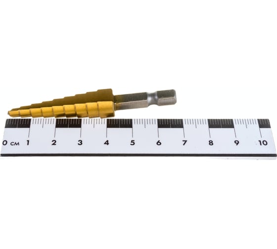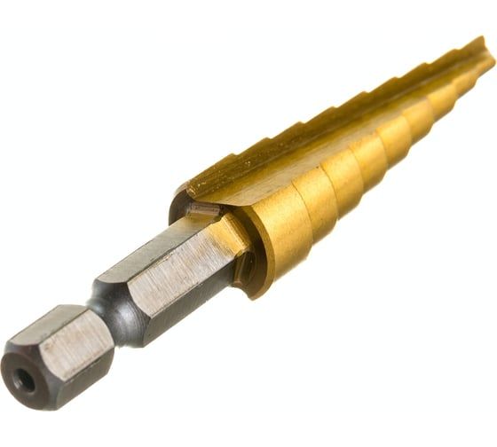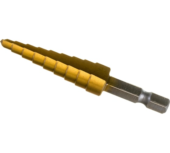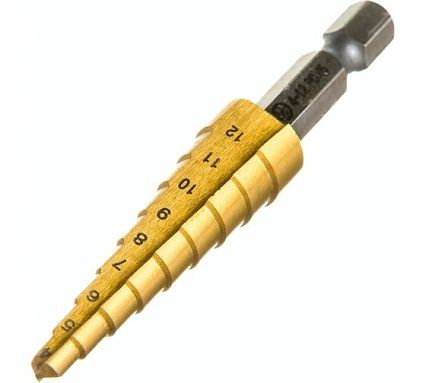 Сверло ступенчатое 4-12 мм, 9 размеров Резолюкс 31401 из износостойкого покрытия нитрида титана, сталь Р6М5. Применяется для последовательного рассверливания и правки отверстий в листовой стали, цветных металлах и пластике.
