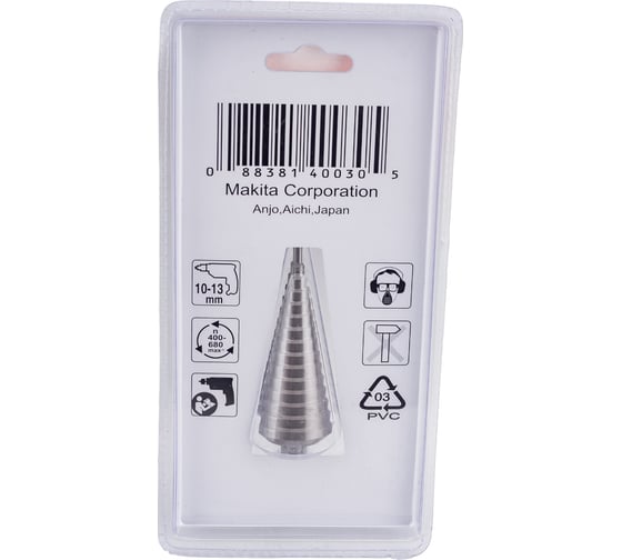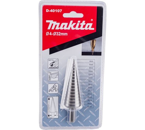 Ступенчатое сверло Makita D-40107 изготовлено из быстрорежущей стали (HSS) и используется совместно с дрелями при выполнении сквозных отверстий в листовой стали и в цветных металлах. Оснастка оптимально подходит для обработки тонких листов без деформаций. Главная особенность сверла - его ступенчатый профиль, за счет чего можно выполнять различные по диаметру отверстия (от 4 до 32 мм, шаг 2 мм), не меняя каждый раз оснастку. Применяют и для расширения уже существующих отверстий. Хвостовик сверла — цилиндрический с тремя шлицами.