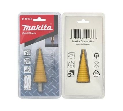 Ступенчатое сверло Makita D-40135 изготовлено из быстрорежущей стали (HSS) с оксид-титановым покрытием и используется совместно с дрелями при выполнении сквозных отверстий в листовой стали и в цветных металлах. Оснастка оптимально подходит для обработки тонких листов без деформаций. Главная особенность сверла - его ступенчато-спиральный профиль, за счет чего можно выполнять различные по диаметру отверстия (от 4 до 32 мм), не меняя каждый раз оснастку. Применяют и для расширения уже существующих отверстий. Хвостовик сверла с фрезерованными шлицами, чтобы не проворачивался в зажимном патроне.
