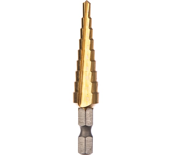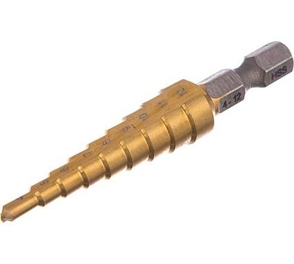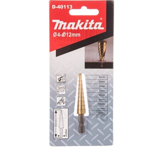 Ступенчатое сверло Makita D-40113 изготовлено из быстрорежущей стали (HSS) с титан-нитридным покрытием (Tin) и используется совместно с дрелями при выполнении сквозных отверстий в листовой стали и в цветных металлах. Оснастка оптимально подходит для обработки тонких листов без деформации. Главная особенность сверла - это его ступенчато-спиральный профиль, за счет чего можно выполнять различные по диаметру отверстия (от 4 до 12 мм), не меняя каждый раз оснастку. Применяют и для расширения уже существующих отверстий. Хвостовик сверла - 1/4".