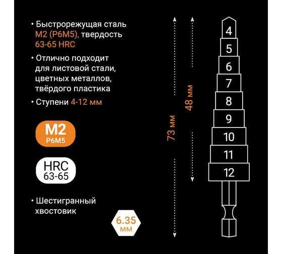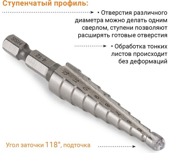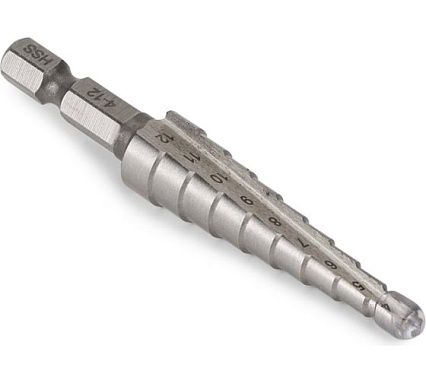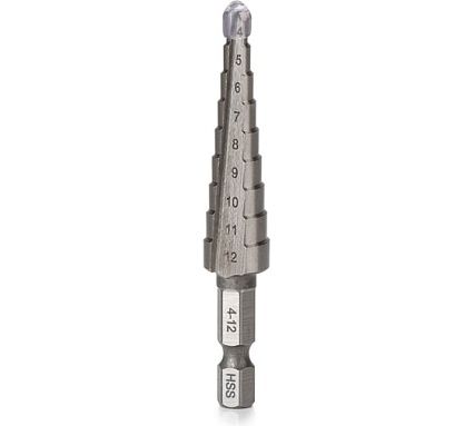 Сверло ступенчатое предназначено для эффективного сверлениятонколистового металла и цветных металлов, твёрдого пластика, древесины без деформаций. Сверло выполнено из высококачественной быстрорежущей легированной стали M2 (Р6М5) твердостью 63-65HRC, которое увеличивает износостойкость инструмента. Надежную фиксацию сверла в патроне инструмента обеспечивает шестигранный хвостовик 1/4" HEX который позволяет устанавливать его не только в электроинструмент с быстрозажимным патроном, но и с патронами типа НЕХ. Благодаря плавному ступенчатому переходу, сверло позволяет выполнять различные по диаметру отверстия (от 4 до 12 мм), не меняя каждый раз оснастку. А также применяется для расширения уже существующих отверстий.