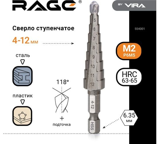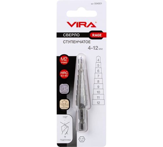 Сверло ступенчатое с шестигранным хвостовиком 4-12 мм RAGE by VIRA