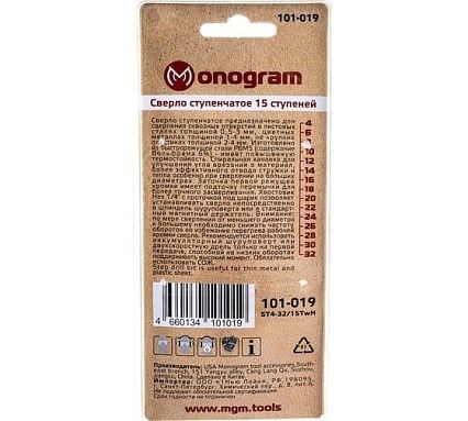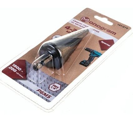Сверло ступенчатое Monogram 101-019 предназначено для сверления сквозных отверстий в листовых сталях толщиной 0,5-3 мм, цветных металлах толщиной 1-4 мм, не хрупких пластиках толщиной 2-4 мм.