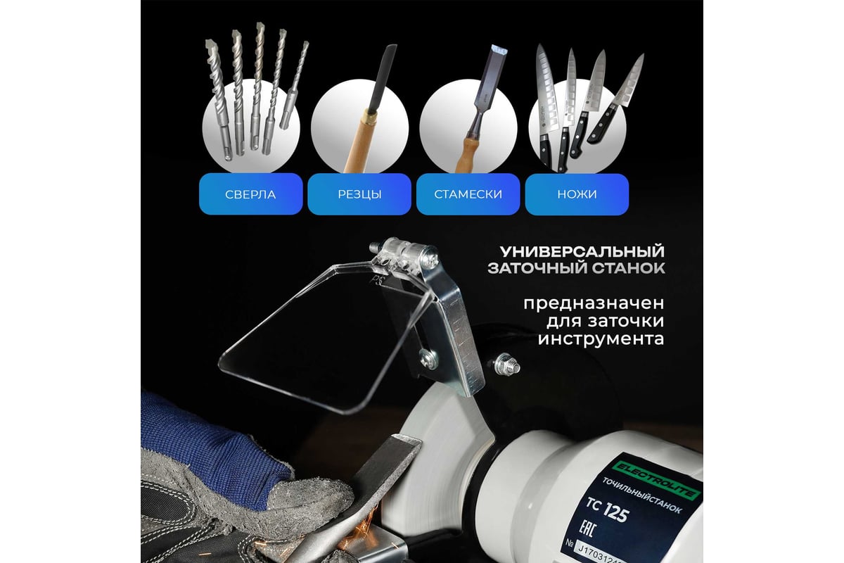 Настольный мини-станок имеет два абразивных камня, с помощью которых можно затачивать, обтачивать и шлифовать режущие инструменты. Каждый шлифовальный круг имеет диаметр 125 мм и толщину 16 мм. Это позволяет обрабатывать лезвия, сверла, стамески и другой режущий инструмент. Резиновые ножки снижают вибрацию, а для фиксации точило можно закрепить на столе. Шлифовальные диски закрыты металлическими кожухами, которые исключают отлет искр за корпус точила и повышают безопасность. При обработке инструмента прозрачные экраны защищают от искр и обеспечивают хорошую видимость.