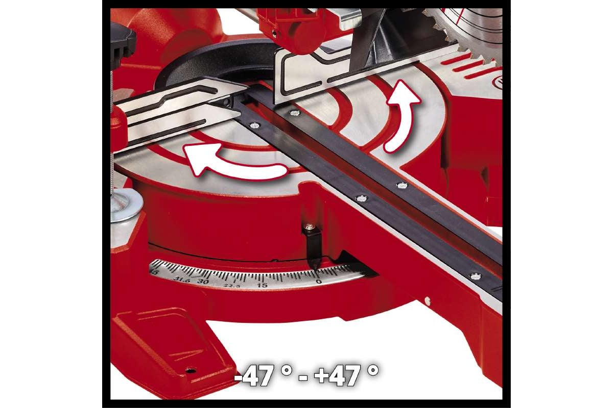 .Пильная головка наклоняется влево на угол до 45°, позволяя осуществлять косой рез и снимать фаски.