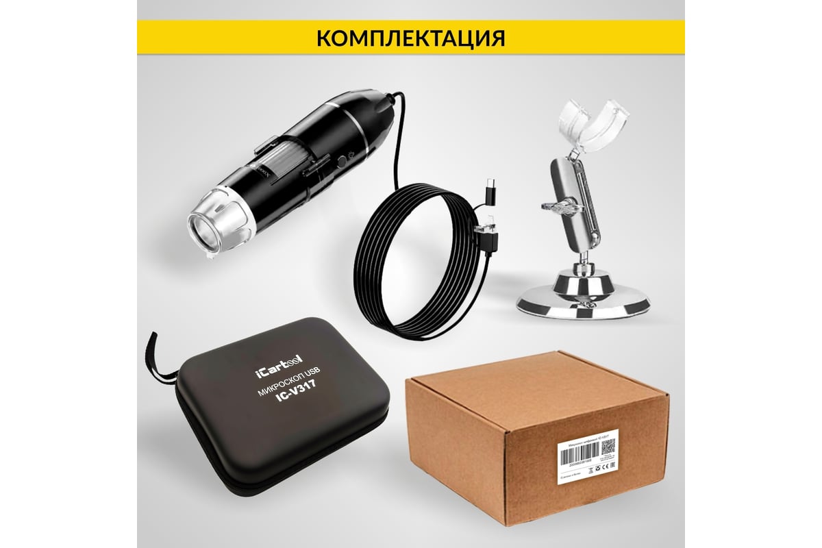 Цифровой портативный микроскоп iCartool IC-V317 обладает увеличением в диапазоне от 50 до 1000 крат. Кабель питания оснащен многофункциональным USB-разъёмом, при помощи которого микроскоп можно подключить к различным устройствам с ОС Android/ Windows/ Mac.