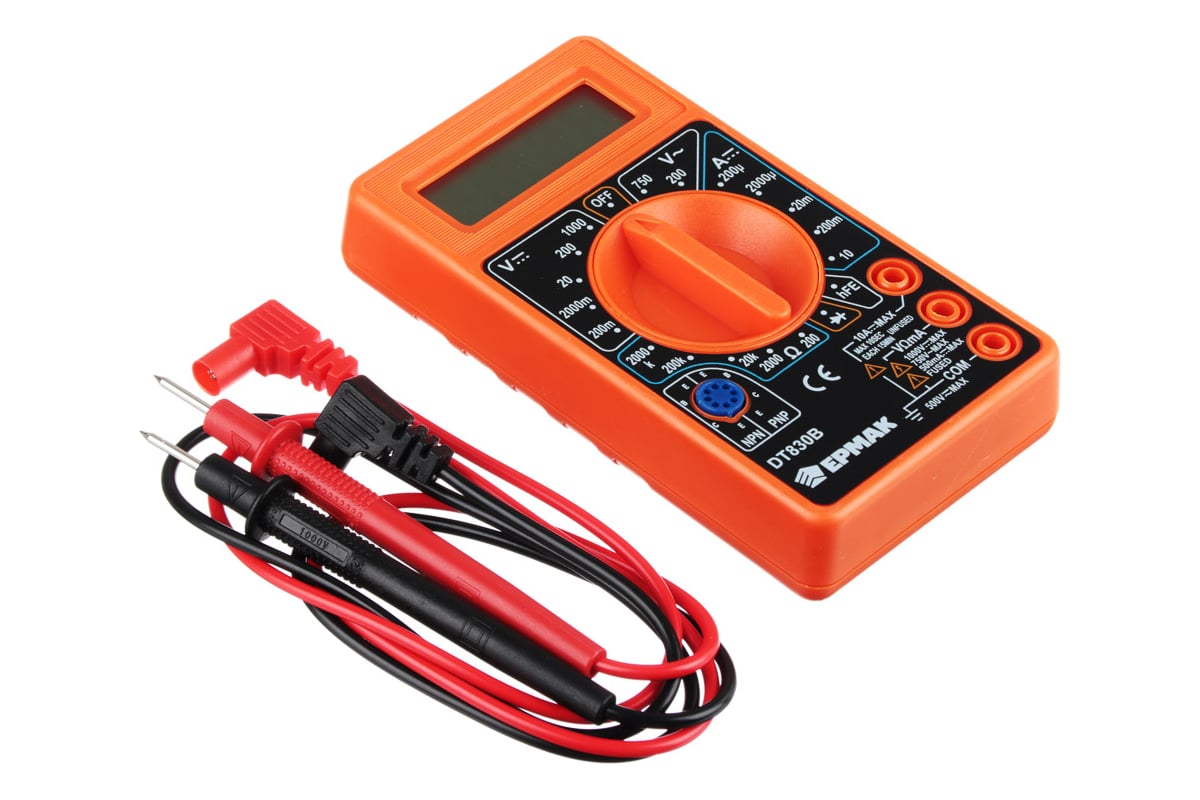 Цифровой мультиметр ЕРМАК DT-830В 660-003 оснащен амперметром, вольтметром и омметром.